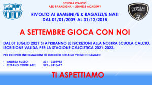 RIVOLTO AI BAMBINI/E & RAGAZZI/E NATI DAL 01/01/2009 AL 31/12/2015 A SETTEMBRE GIOCA CON NOI DAL 01 LUGLIO 2021 SI APRIRANNO LE ISCRIZIONI ALLA NOSTRA SCUOLA CALCIO.